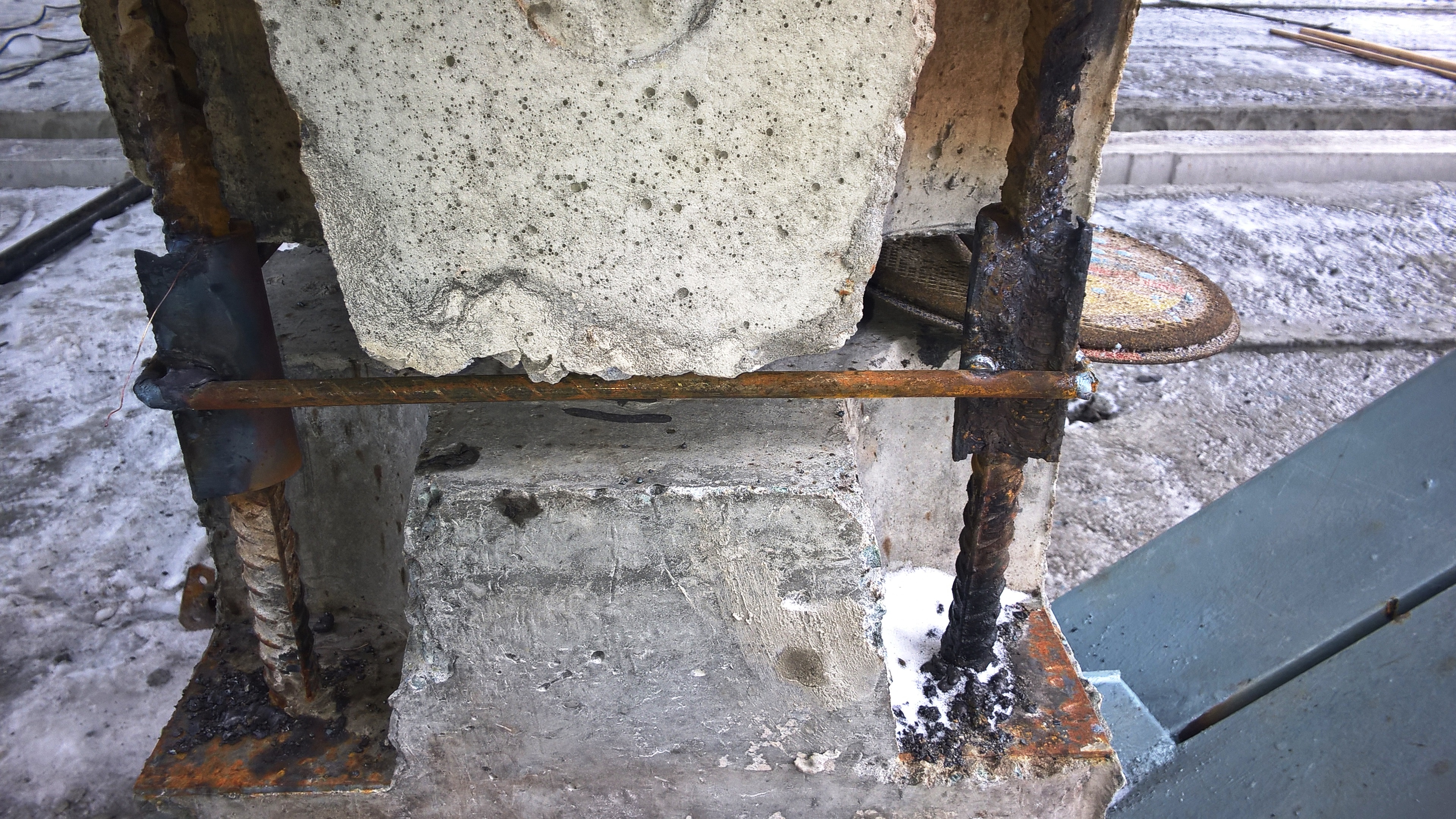 Испытание сварных соединений на стальной скобе накладки (проба, стержень).
